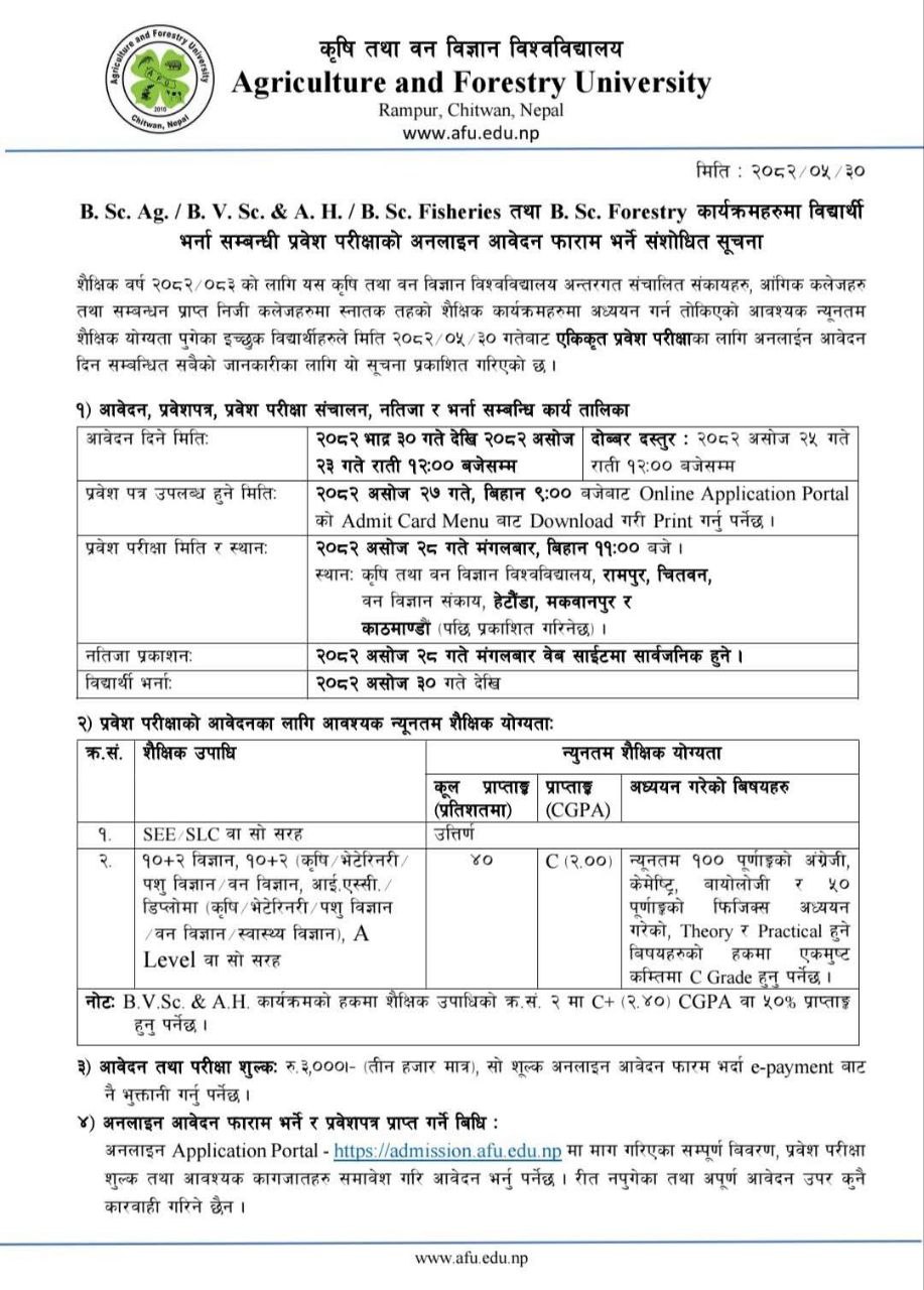 Agriculture and Forestry University, Rampur, Chitwan, Nepal, has published a notice to inform that the deadline for submitting Online applications for the Bachelor of Science (BSc) in Forestry program has been extended. This program is offered in the faculties, constituent colleges, and affiliated private colleges under the Agriculture and Forestry University for the academic session 2082/083.