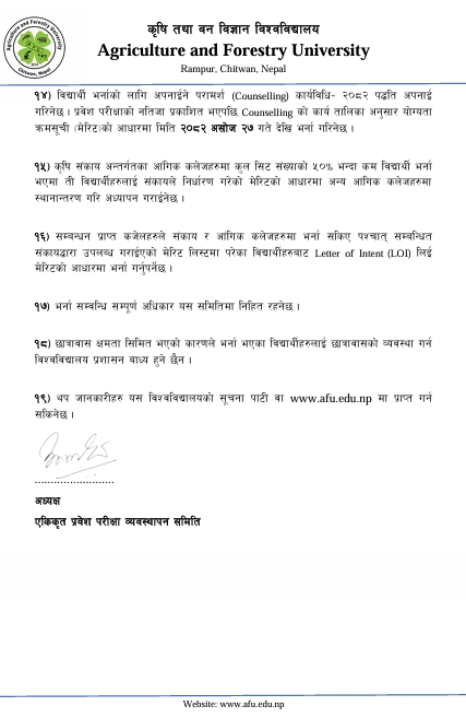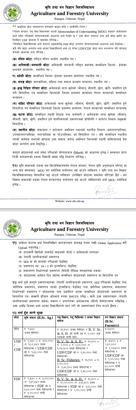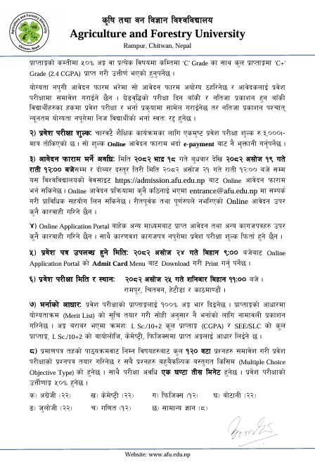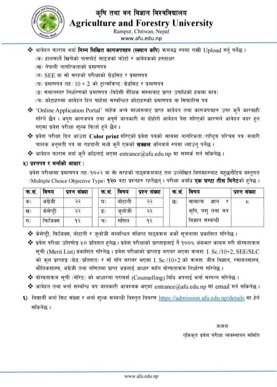 Entrance Examination Center: Agriculture and Forestry University, Rampur (Chitwan), Faculty of Forestry, Hetauda, and Kathmandu (will be published later)