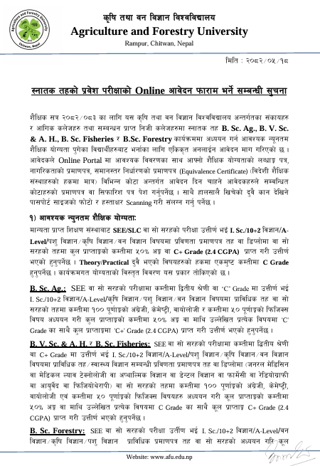 BSc Forestry- Agriculture and Forestry University Entrance Exam Notice 2082