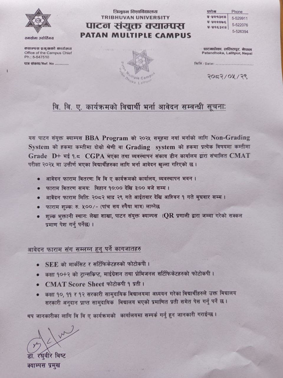Patan Multiple Campus, located at Patan Dhoka, Lalitpur, is affiliated with Tribhuvan University. The campus has announced admissions open for the following programs: