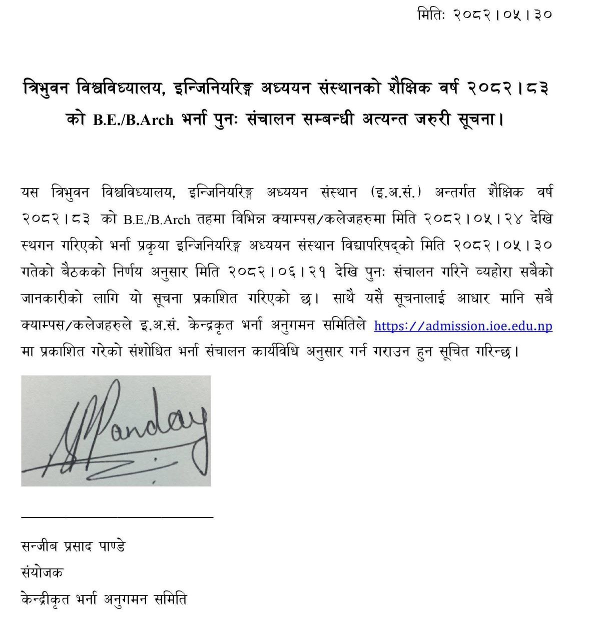 According to the decision of the Academic Council of the Institute of Engineering (IOE) on 2082/05/30, this notice has been published for the information of all concerned that the admission process for B.E./B.Arch level in various campuses/colleges under Tribhuvan University, Institute of Engineering (IOE), which was postponed from 2082/05/24, will be re-operated from 2082/06/21.