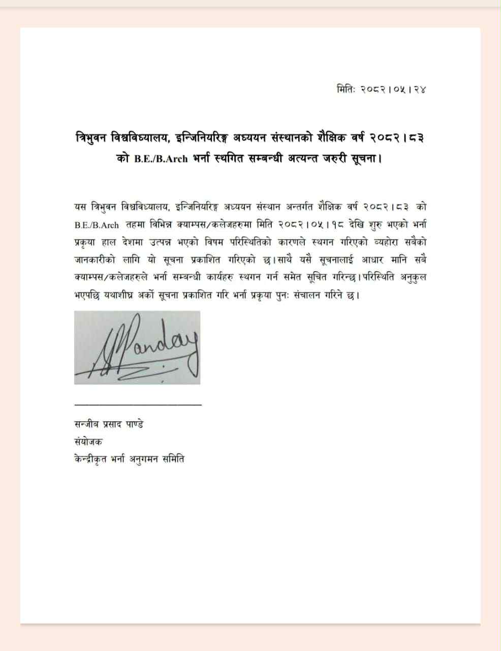 The admission process, which was scheduled to commence on 2082/05/18 in various campuses and colleges, has been temporarily halted due to the current adverse situation prevailing in the country.