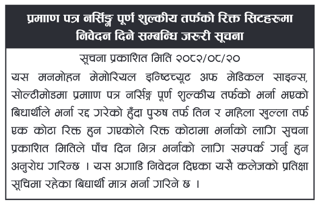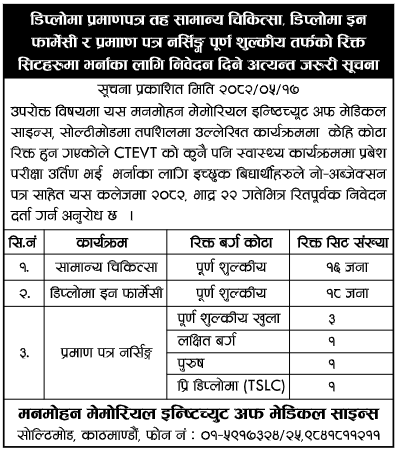 Interested students who have filled out forms for any CTEVT health program and are interested in admission in few vacant seats are requested to submit a formal application, along with a no-objection letter, to the college by Bhadra 22, 2082.