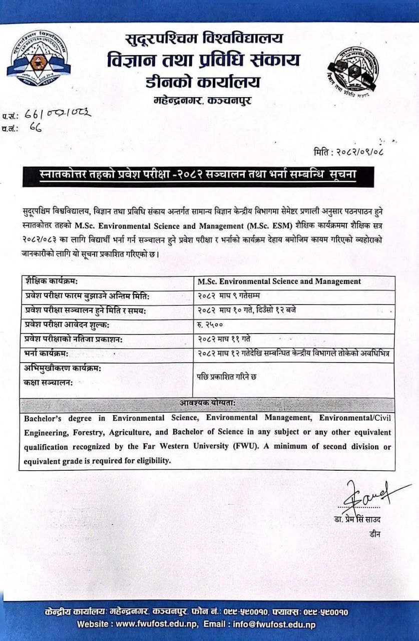 The Faculty of Science and Technology, Far Western University, has announced the admission open for new students for the academic year 2082/83 in the Master of Science in Environmental Science and Management (M.Sc. ESM) program.