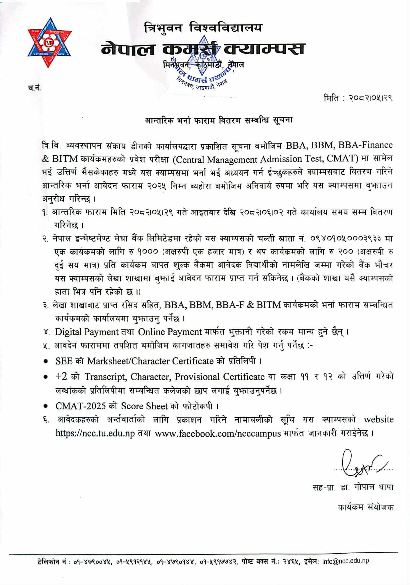 Nepal Commerce Campus invites applicants for admission in various programs in the academic session 2079/80. Students who have passed the CMAT exam conducted by the Tribhuvan University, Faculty of Management, Dean's Office, can apply for the following programs.