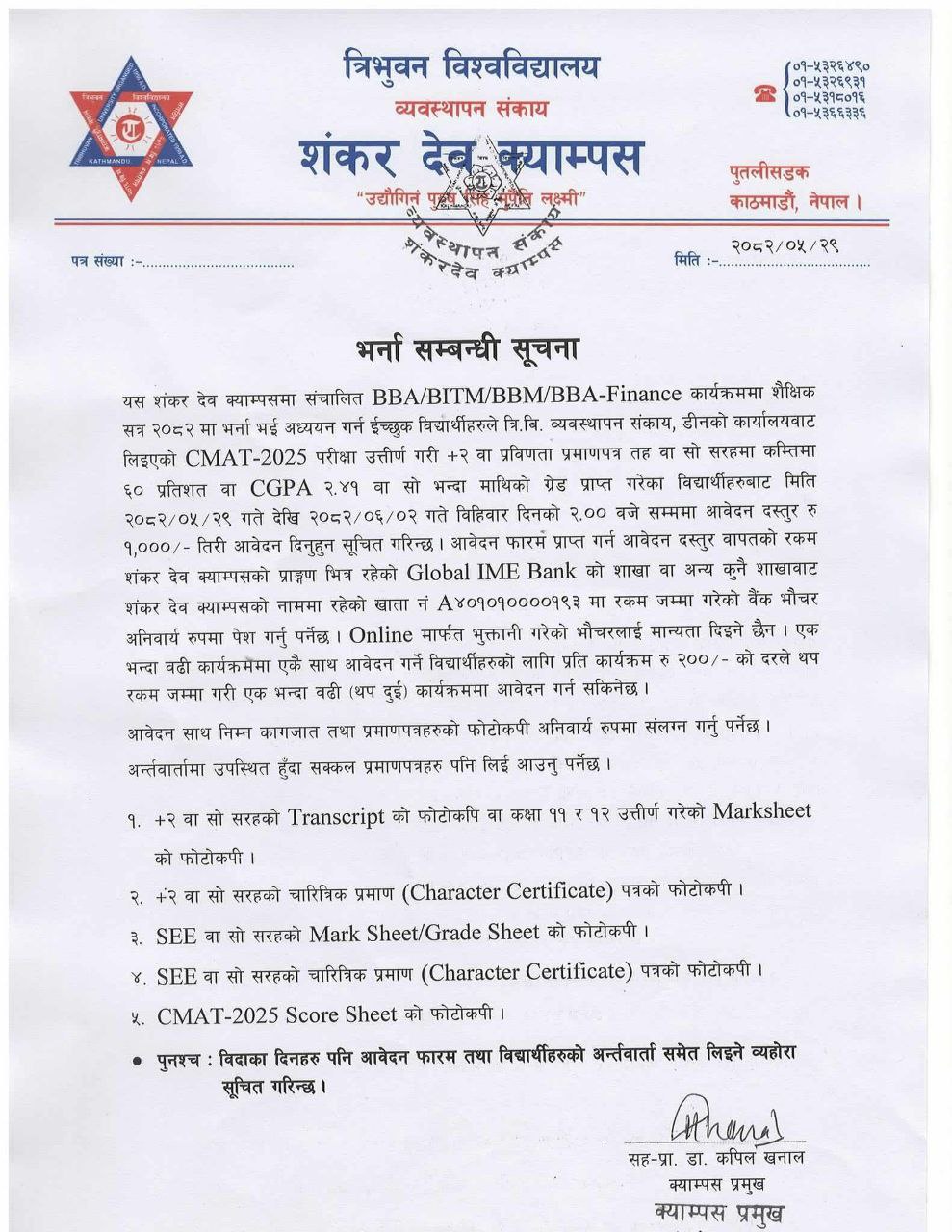 Payment should be made at Global IME Bank, Shankar Dev Campus branch or any other branch.