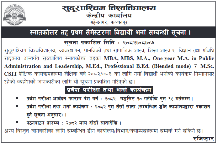 Semester-based Masters programs are available at Far Western University's affiliated and constituent campuses throughout Nepal, as well as the Central Department. The application form must be sent to the college to which the student wishes to enroll.