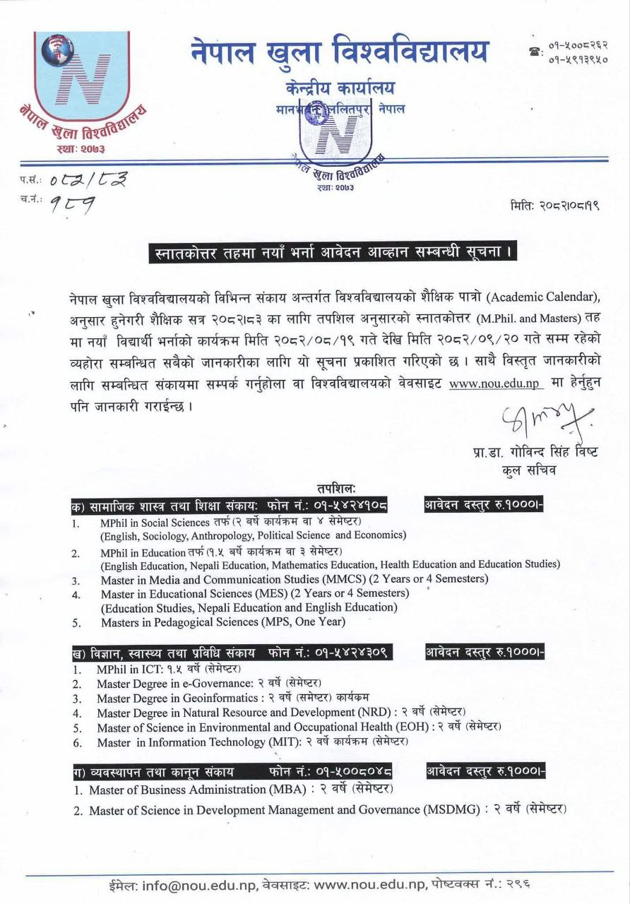Nepal Open University (NOU) has announced the opening of applications for its academic programs for the upcoming session. The Central Office of NOU, located in Manbhavan, Lalitpur, invites students to apply for a wide range of MPhil and Master's degree programs under the faculties of Social Sciences, Education, Health, and Management for the academic year 2082.