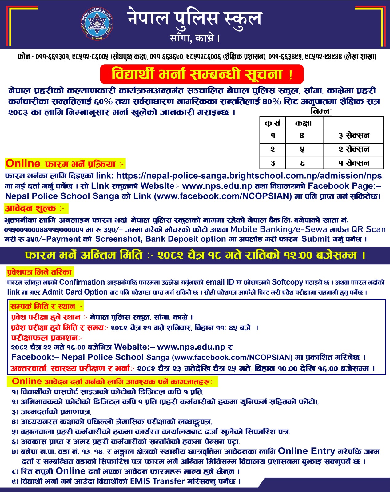 Nepal Police Higher Secondary School, Kavre, Sanga, opens admission from grades 4 to 6 for the academic session 2083.