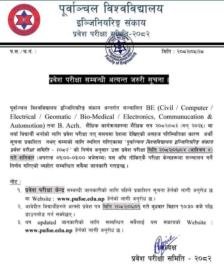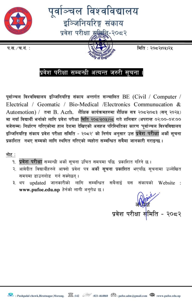 Purbanchal University's Faculty of Engineering has postponed the entrance examination for new admissions to its Bachelor of Engineering programs (BE Civil/ Computer/ Electronics, Communication, and Automation/Electrical/ Geomatic/ Biomedical and B.Arch.), originally scheduled for Bhadra 28, 2082, until further notice.