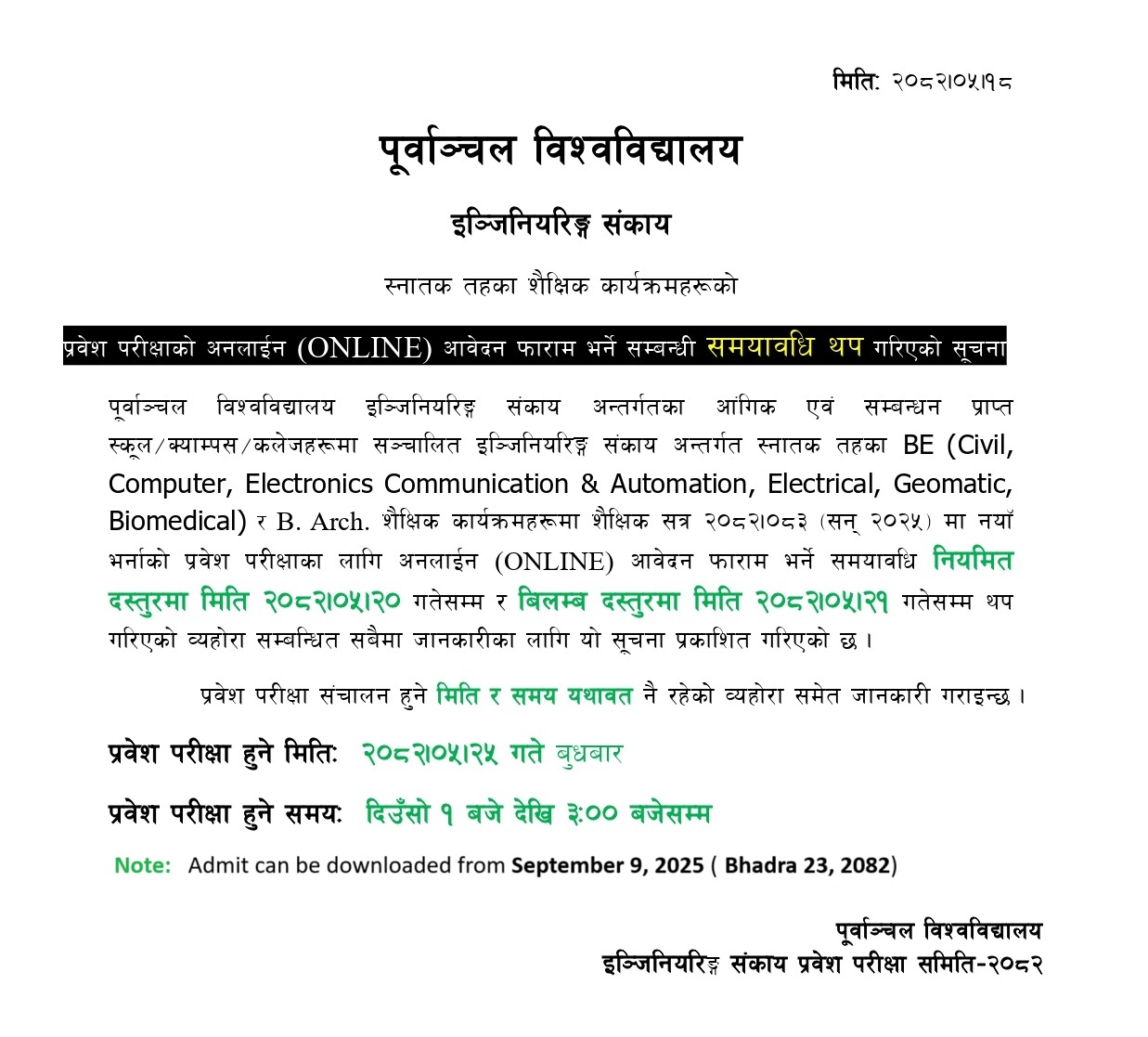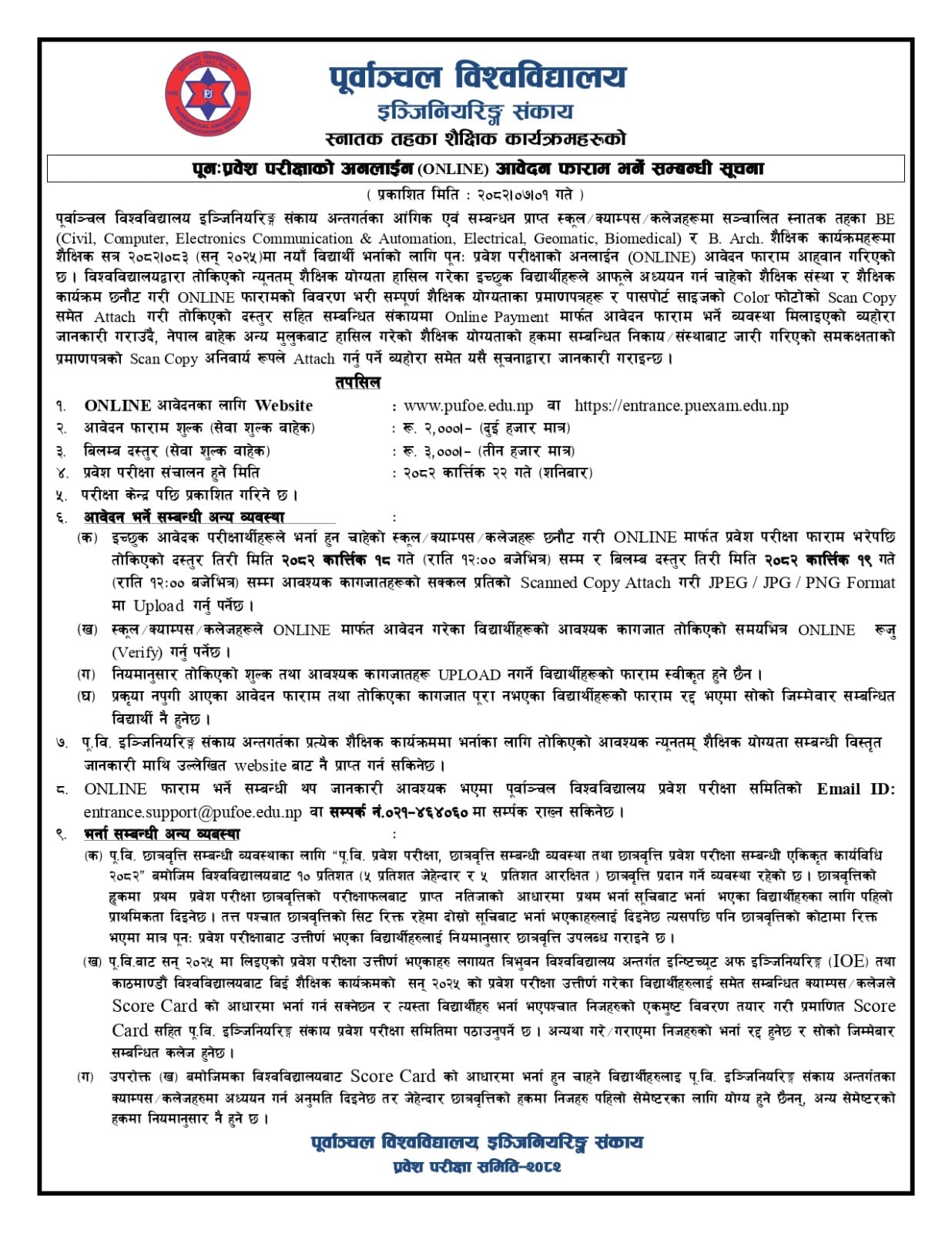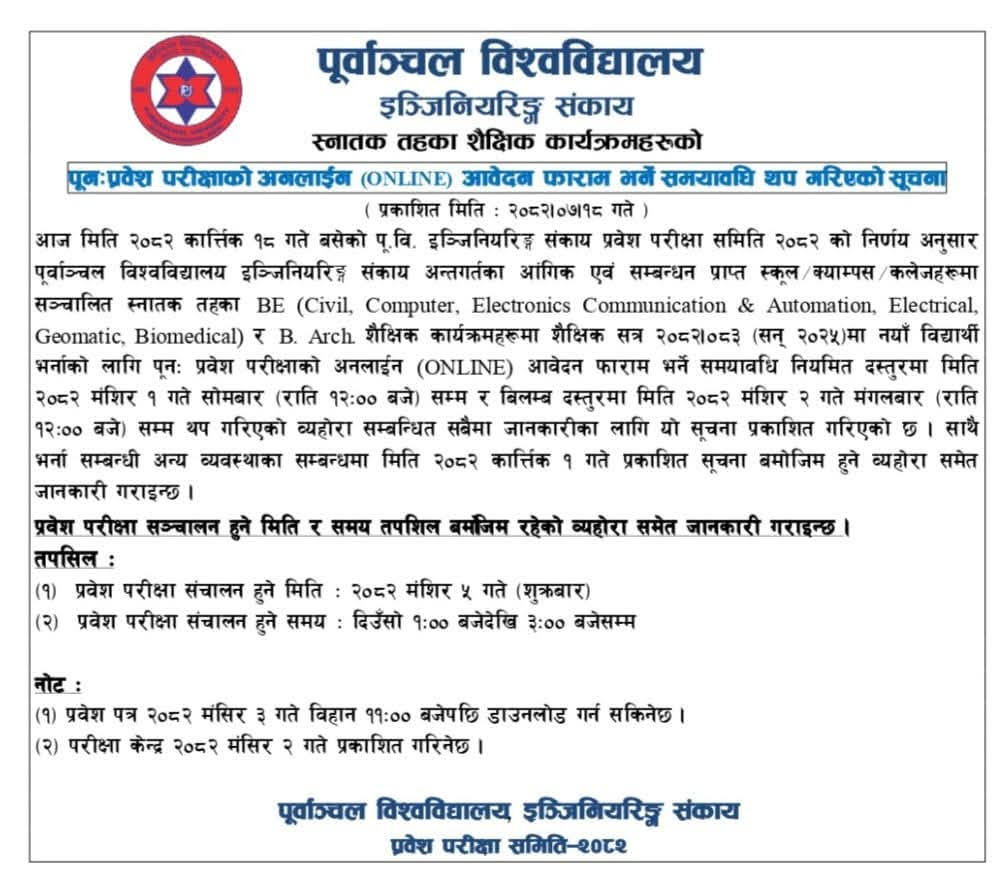 Purbanchal University, Faculty of Engineering, has extended the deadline for submitting applications for a Re-Entrance Examination for admission to its Bachelor of Engineering (BE Civil, Computer, Electronics Communication and Automation, Electrical, Geomatic, Biomedical) and Bachelor of Architecture (B. Arch) programs for the academic year 2082/83.