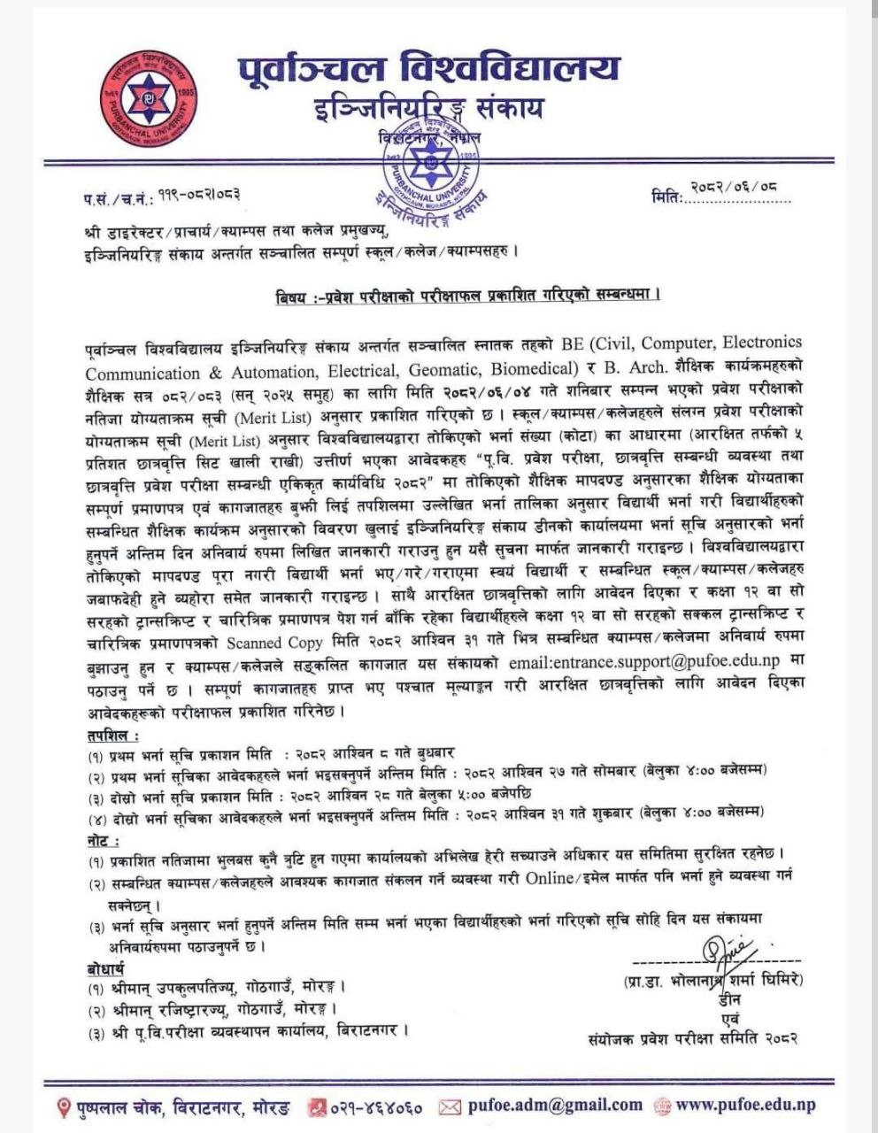 Purbanchal University's Faculty of Engineering has published the merit list of the entrance examination held on Ashwin 4, 2082, for admission to BE (Civil, Computer, Electronics Communication & Automation, Electrical, Geomatic, Biomedical) and B. Arch programs for the academic year 2082/83.