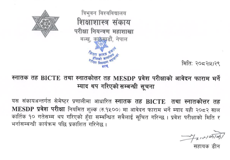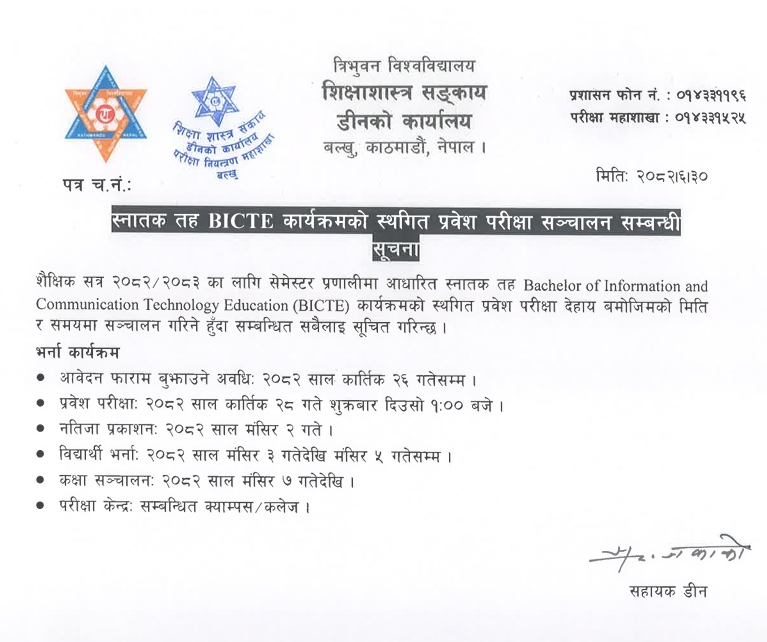 Tribhuvan University, Faculty of Education, has published the schedule for the postponed entrance examination of the Bachelor of Information and Communication Technology Education (BICTE) program under the semester system for the academic year 2082/2083.
