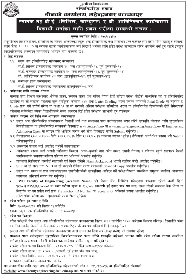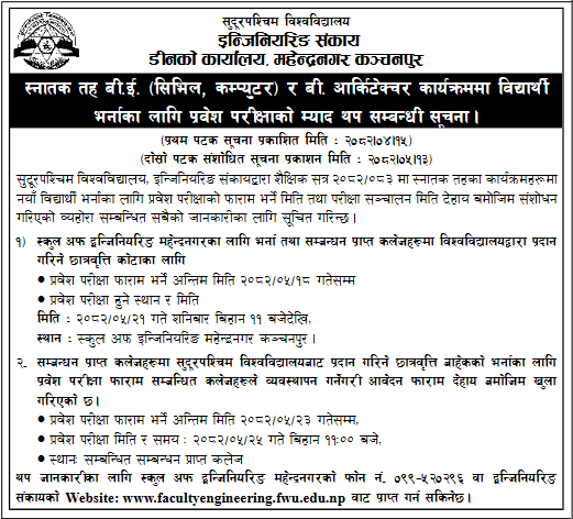 Far Western University, Faculty of Engineering, has revised the date for filling the entrance examination form and the date of examination for admission of new students to undergraduate programs in the academic session 2082/083 as follows, for the information of all concerned.