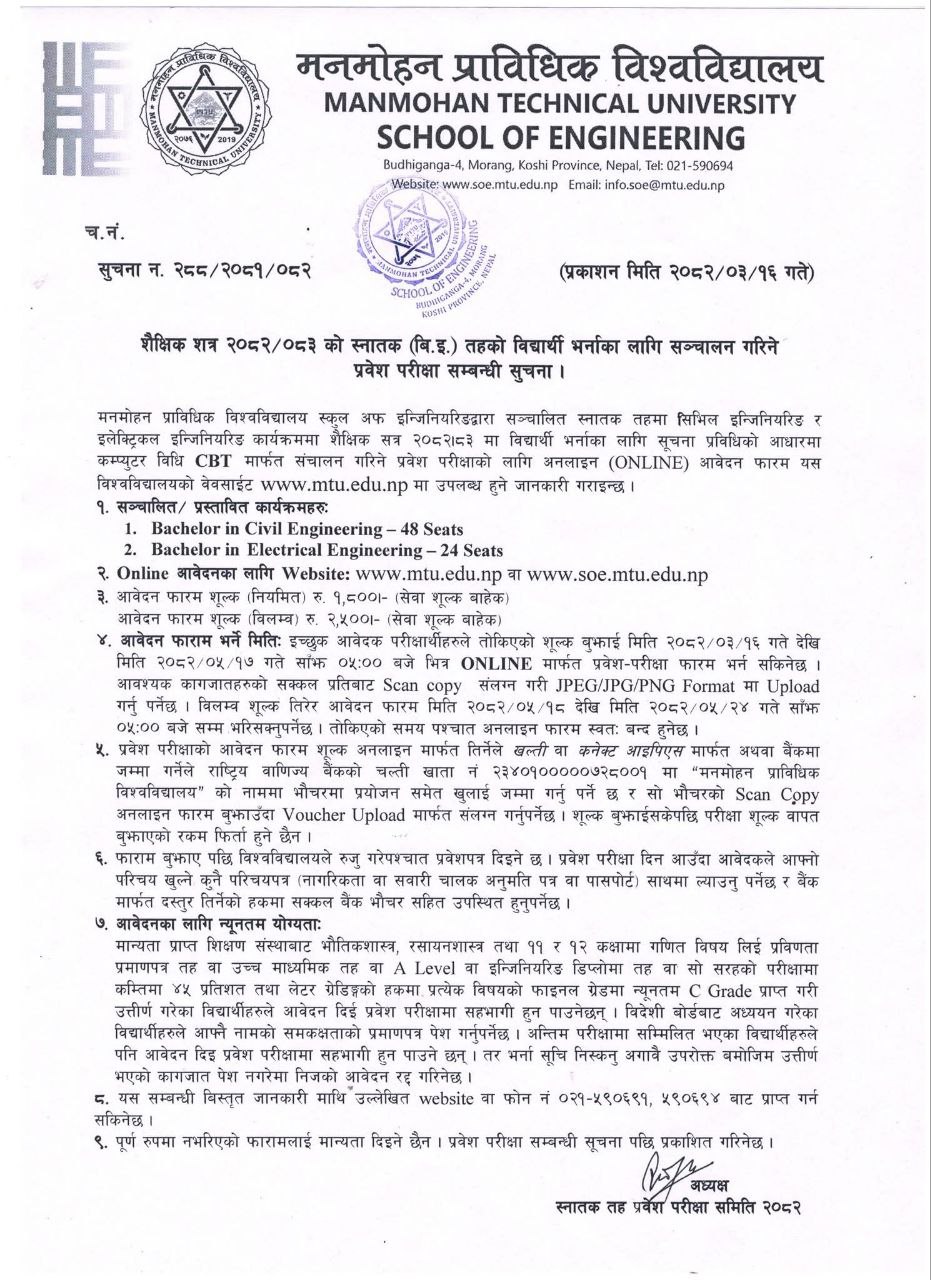 Manmohan Technical University, Central Campus, School of Engineering, Budhiganga Morang announces online application forms for the Computer-Based Test (CBT) entrance examination for admission to the Engineering programs for the academic year 2082/83.