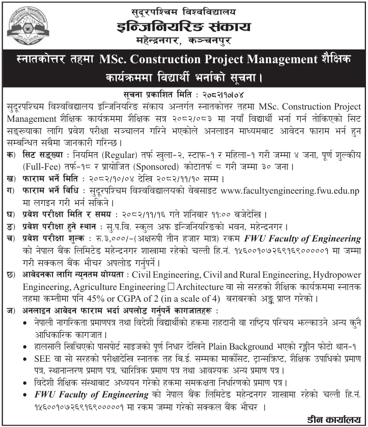 Far-Western University (FWU), Faculty of Engineering, Mahendranagar, Kanchanpur has announced the admission open for MSc Construction Project Management for 2026.