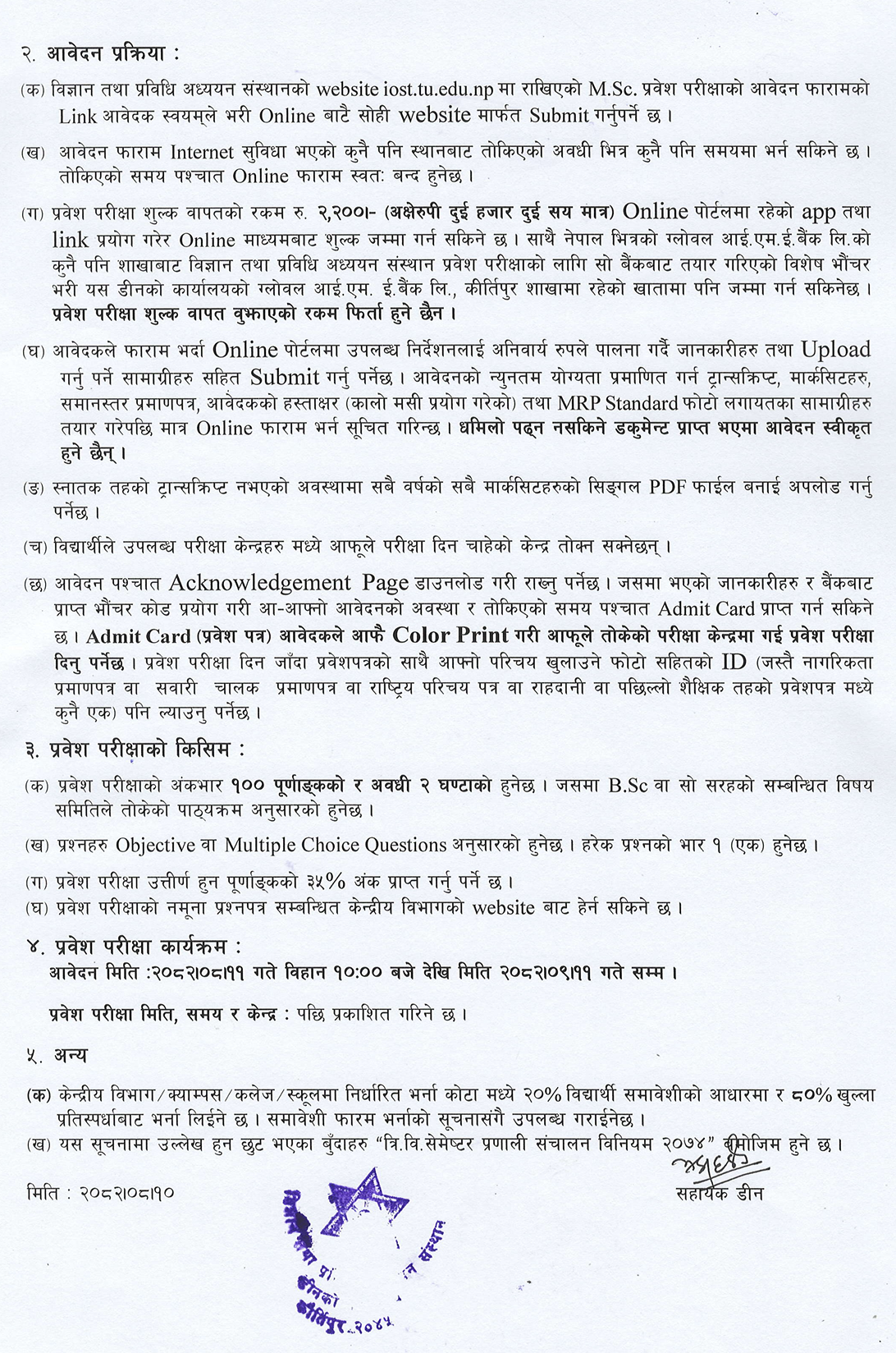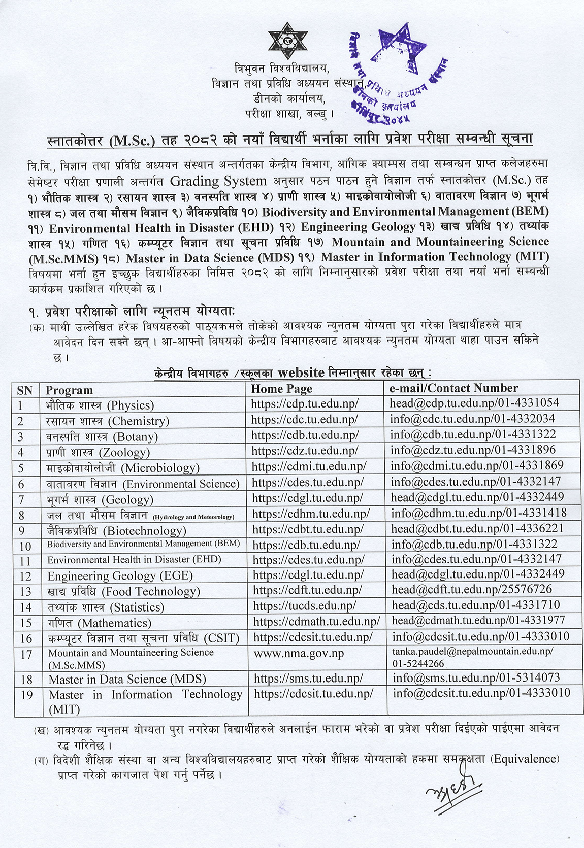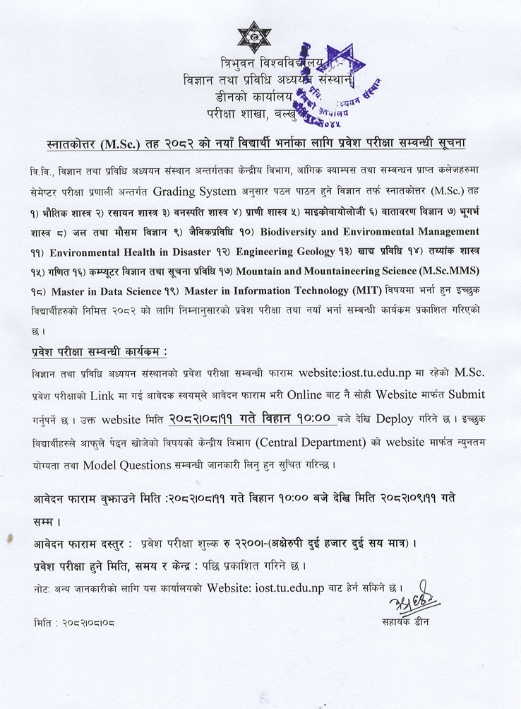 Tribhuvan University (TU), Institute of Science and Technology (IoST), Office of the Dean has published the entrance examination notice for new admissions at the master's level under the grading system for 2082 BS for the following programs: