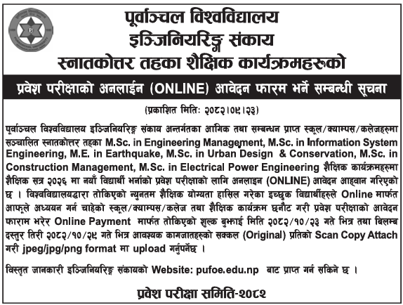 Purbanchal University School of Engineering (PUSOE) announces online application for the entrance examination of its postgraduate program for the academic session 2026. The entrance examination for the following program will be held at PU-affiliated and constituent schools/campuses/colleges.