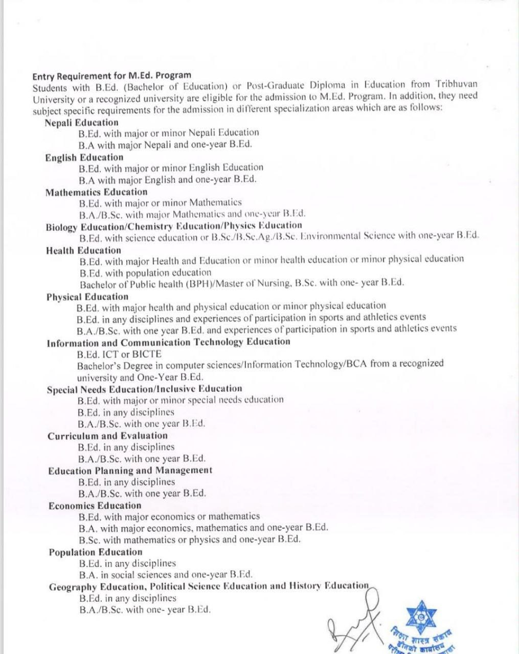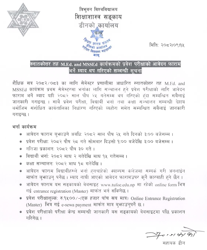 Tribhuvan University, Faculty of Education, has extended the application deadline and amended the date for the entrance examination of M.Ed. and MSSEd programs for the academic session 2082/083 as follows: