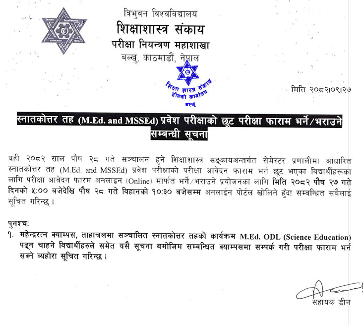 Students wishing to enroll in the M.Ed. ODL (Science Education) program conducted at Mahendra Ratna Campus, Tahachal, are also eligible to fill out the examination form by contacting the respective campus in accordance with this notice.