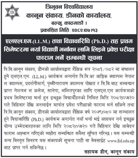 Tribhuvan University, Faculty of Law (FoL), located in Pradarshani Marg, Kathmandu, announces admission open for PhD program in Law.