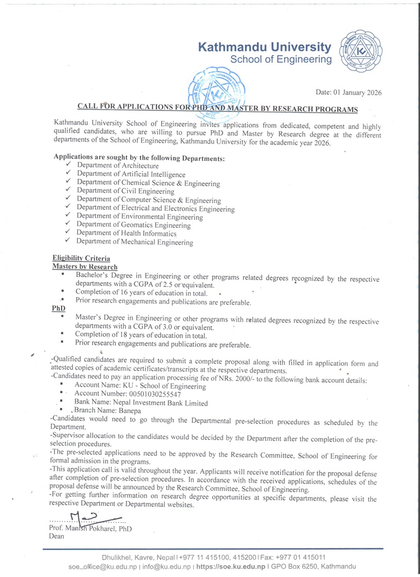 Kathmandu University School of Engineering invites applications from dedicated, competent and highly qualified candidates, who are willing to pursue PhD and Master's by Research degree in the different departments of the School of Engineering, Kathmandu University for the academic year 2026.