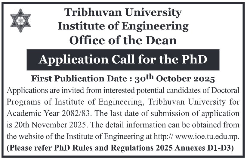 The last date for the submission of the application is November 20, 2025 (Mangsir 4, 2082). Detailed information can be obtained from the website of the Institute of Engineering at www.ioe.tu.edu.np.