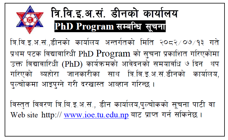 Tribhuvan University, Institute of Engineering, Office of the Dean has extended the deadline for submitting applications from interested potential candidates for the Doctoral Programs at the Institute of Engineering, Tribhuvan University, for the academic year 2082/83.