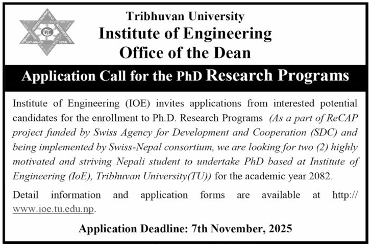 The Office of the Dean, Institute of Engineering, Tribhuvan University, invites applications from interested and potential candidates for enrollment in the Ph.D. program. Research Programs (As a part of the ReCAP project funded by the Swiss Agency for Development and Cooperation (SDC). The program is being implemented by the Swiss-Nepal consortium.