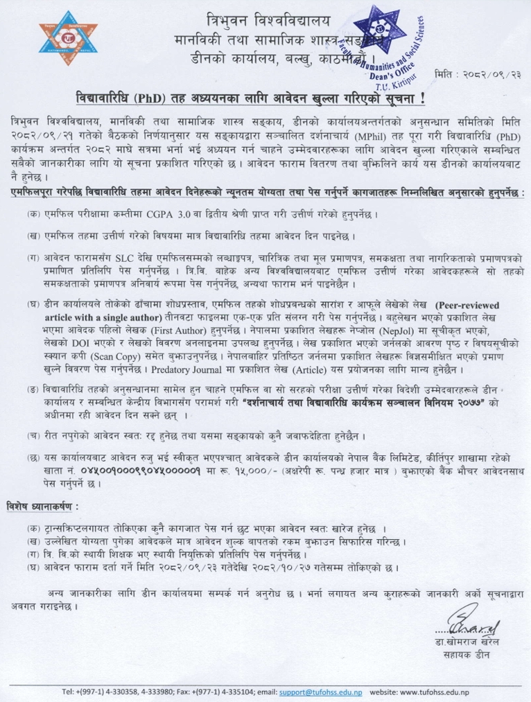The announcement follows a decision by the Research Committee at its meeting on 2082/09/21. As per the notice issued by the Dean’s Office, candidates who have completed their MPhil under the Faculty are eligible to apply for the PhD program.