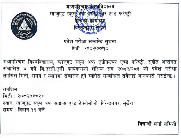 Mid-West University, Graduate School of Agriculture and Forestry, has issued the re-entrance examination schedule for admission to the four-year Bachelor of Science in Agriculture (BSc Ag) for the academic year 2082/83.
