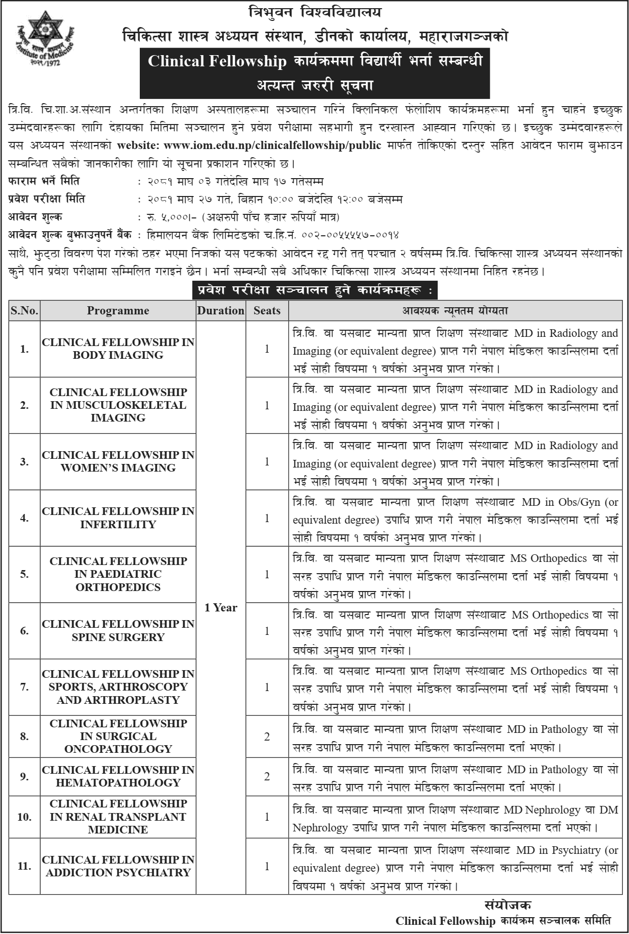 Institute of Medicine | Tribhuvan University, Maharajganj, opens applications in the Clinical Fellowship Program.