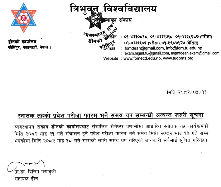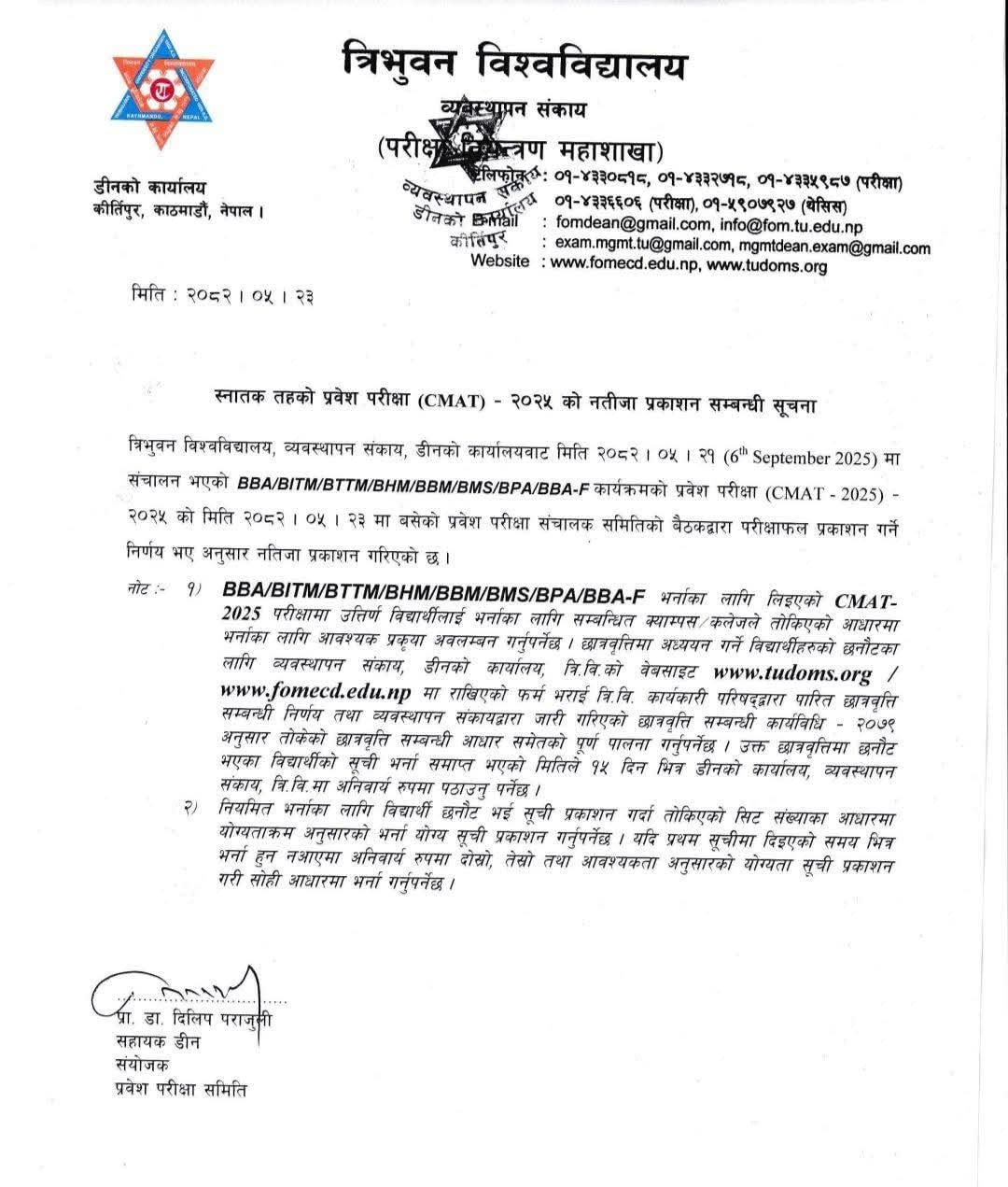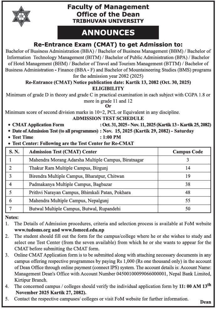 Faculty of Management, Office of the Dean, Tribhuvan University announces Re-Entrance Exam (CMAT) for admission to Bachelor of Business Administration (BBA), Bachelor of Business Management (BBM), Bachelor of Information Technology Management (BITM), Bachelor of Public Administration (BPA), Bachelor of Hotel Management (BHM), Bachelor of Travel and Tourism Management (BTTM), Bachelor of Business Administration - Finance (BBA- F) and Bachelor of Mountaineering Studies (BMS) programs for the admission year 2082 (2025).