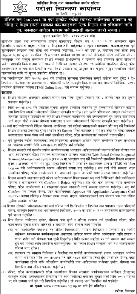 The Council for Technical Education and Vocational Training (CTEVT), Examination Controller Office, Sanothimi, Bhaktapur, has published an urgent notice regarding re-application for vacant seats in full-fee health programs (excluding Nursing and Midwifery) for the academic year 2082/83.