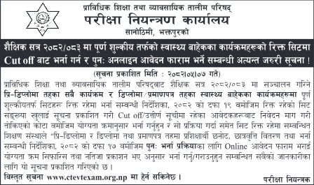 The Council for Technical Education and Vocational Training (CTEVT) has published a notice for new admissions in various Certificate and Diploma-Level programs (except the health program) for the fully paid schemes for the academic year 2082.
