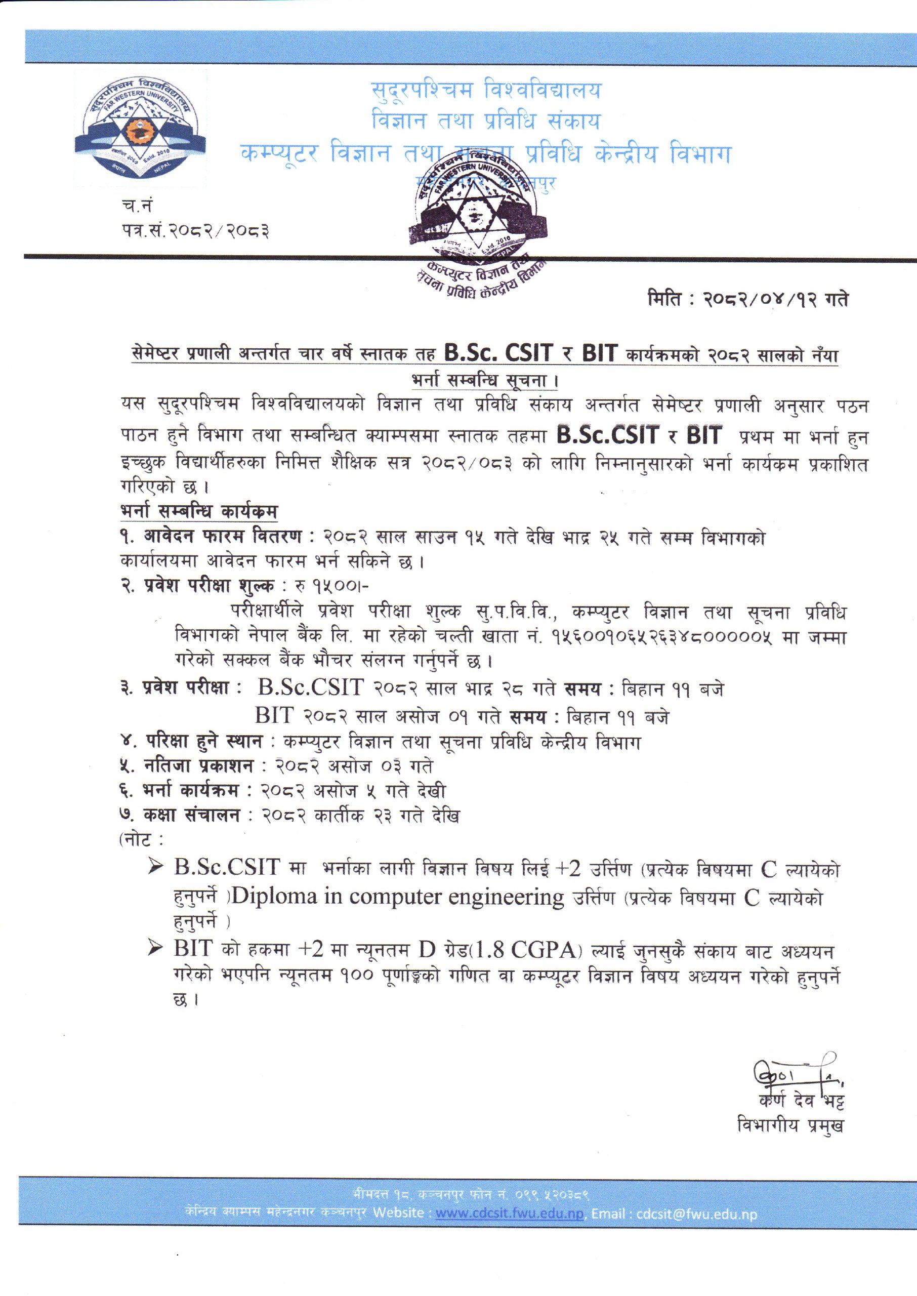 Far Western University, Faculty of Science and Technology, announces admissions open for the academic year 2082/083. Applications are invited from eligible and interested candidates for enrollment in the first year of the four-year Bachelor of Science in Computer Science and Information Technology (B.Sc. CSIT) and Bachelor of Information Technology (BIT) programs. Both programs are conducted under the semester system and are available at the university's central departments as well as its affiliated campuses.