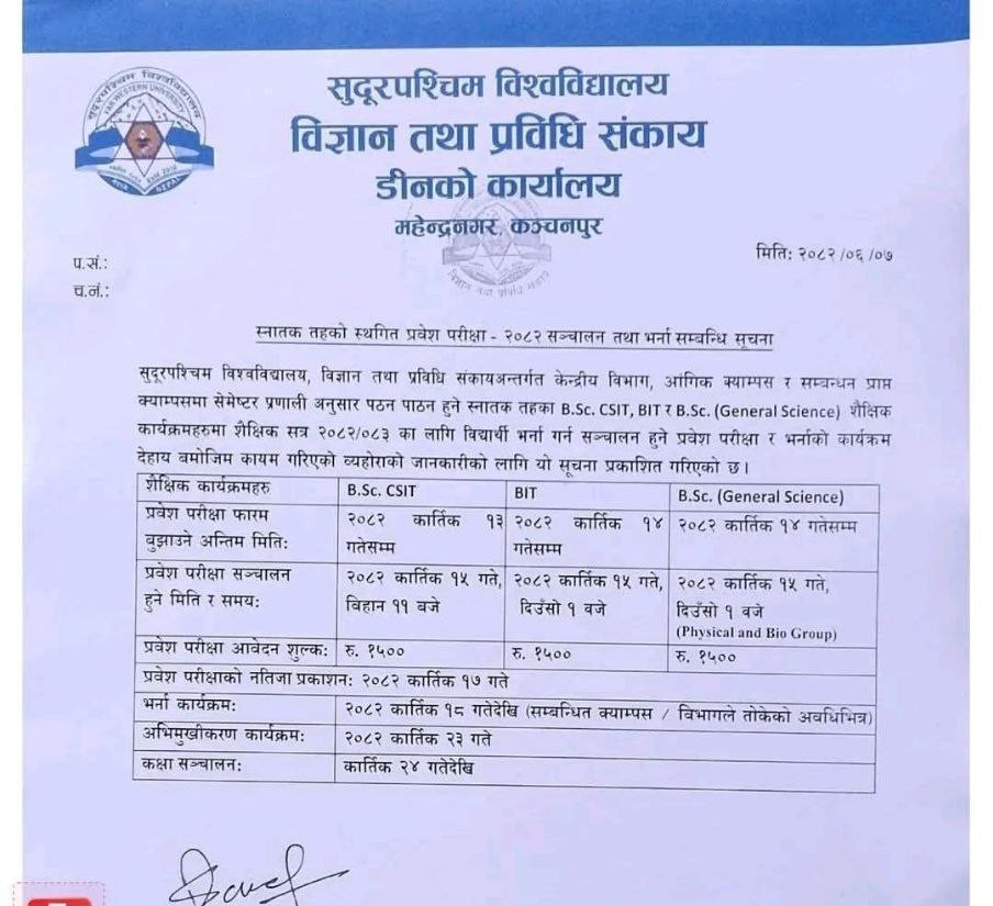 Far Western University's Faculty of Science and Technology has extended the application submission deadline for entrance examination for new enrollment in the first year of the four-year Bachelor of Science in Computer Science and Information Technology (BSc. CSIT), Bachelor of Information Technology (BIT), and BSc. (General Science) programs. Along with the deadline, the university also published a revised examination schedule for the programs that were previously postponed due to adverse circumstances in the country following the Gen Z protest. The new schedule is provided below: