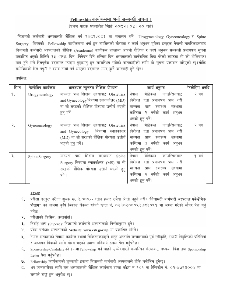 The Civil Service Hospital has announced that applications are open for the Fellowship Program in Urogynecology, Gyneoncology, and Spine Surgery. Eligible and interested Nepali citizens must submit the required documents verifying their academic qualifications and work experience to the Civil Service Hospital's academic department within 15 days of the notice's publication.