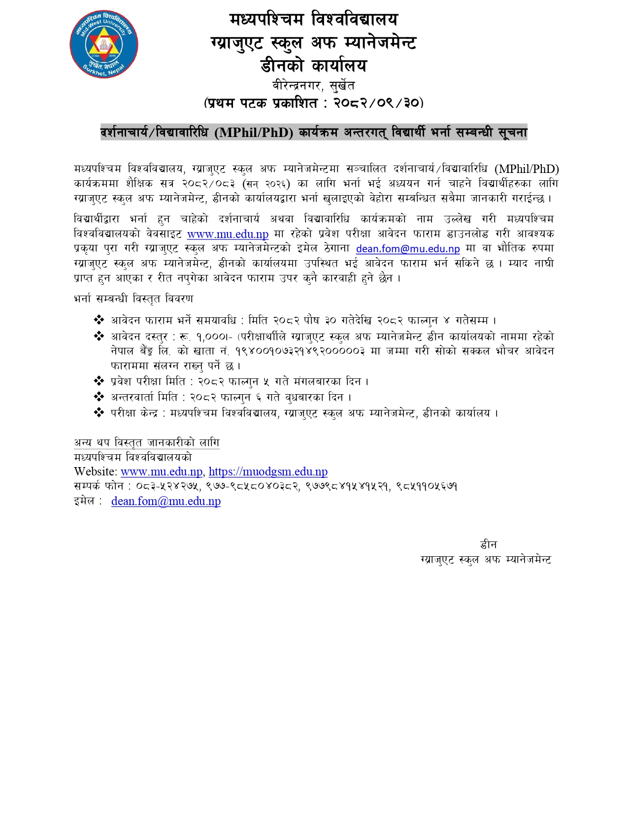Mid-West University (MWU) has opened applications for its Master of Philosophy (MPhil) and Doctor of Philosophy (PhD) programs under the Graduate School of Management for the academic year 2082/83 (2026).
