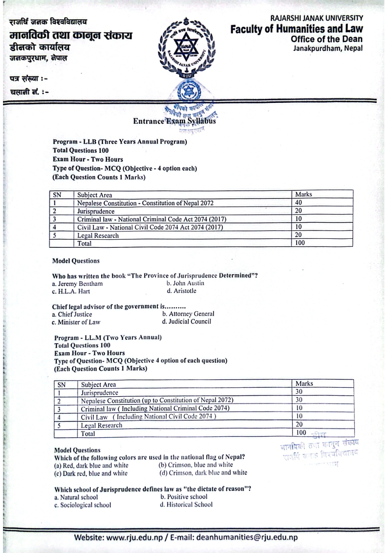 Bachelor of Law (LLB) at Rajarshi Janak University (RJU) is a three-year annual program. Any student who has earned a bachelor's degree in any field is eligible to enroll in this course. For admission to this program, students must take the entrance exam conducted by RJU.