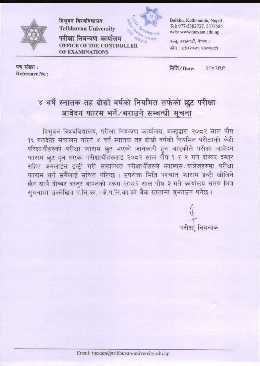 Tribhuvan University (TU), Office of the Controller of Examinations, Balkhu, has announced a final opportunity for 4-year Bachelor Level second-year regular students who missed the initial deadline to submit their examination application forms.