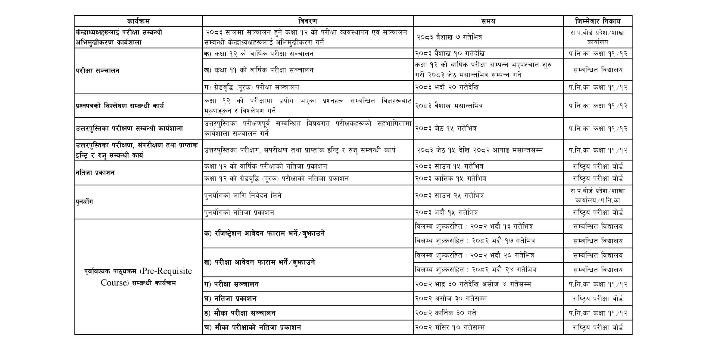 - The timetable for the annual examination of class 12 regular, partial/grade increment, and class 11 (partial/grade increment) students to be conducted in the month of Baisakh will be published by Falgun 1, 2082.