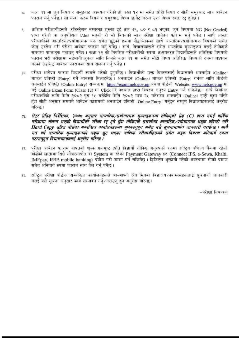 For Class 12 regular exam applicants, a minimum grade of D in theoretical subjects and C in internal evaluation/practicals in all Class 11 subjects is necessary, with a registration number starting with 82. Along with the exam application form, they must attach the Class 11 grade sheet certified by the respective school from where they were enrolled in 2082.