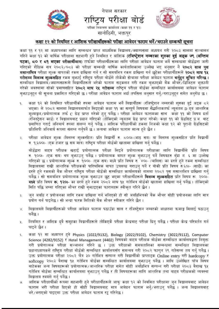The National Examination Board has issued a call for exam applications for both regular and partial grade increments for Class 12 and grade increments for Class 11 candidates. In the year 2082, those with registration numbers ending in 79, 80, and 81 from both Class 11 and Class 12 are required to submit their exam applications by the end of Poush, 2082 with standard fees and until the 15th of Magh, 2082 with late fees.