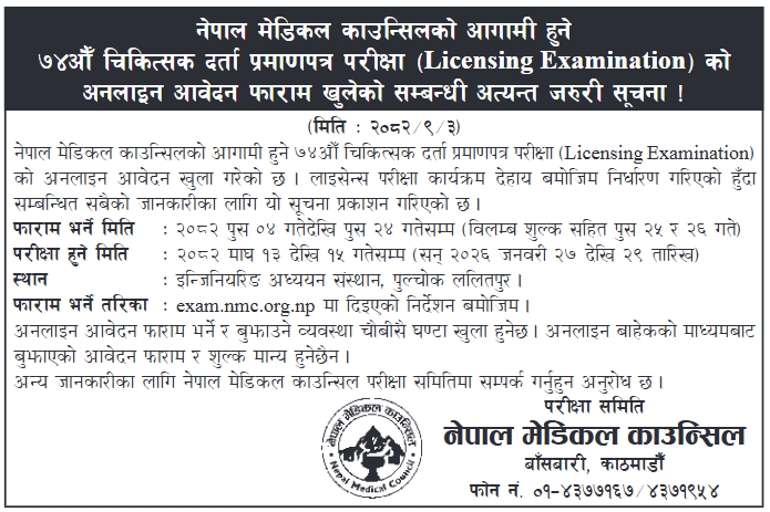 Nepal Medical Council (NMC) has opened applications for the upcoming 74th Physician Registration Certificate Examination.