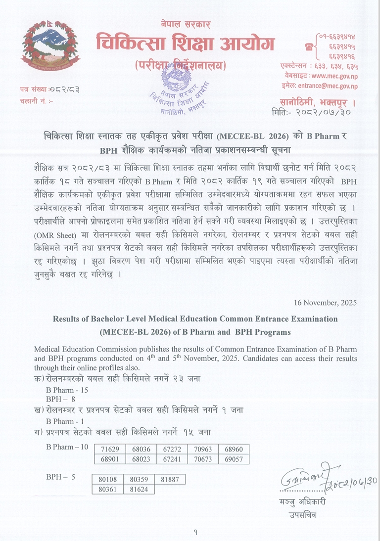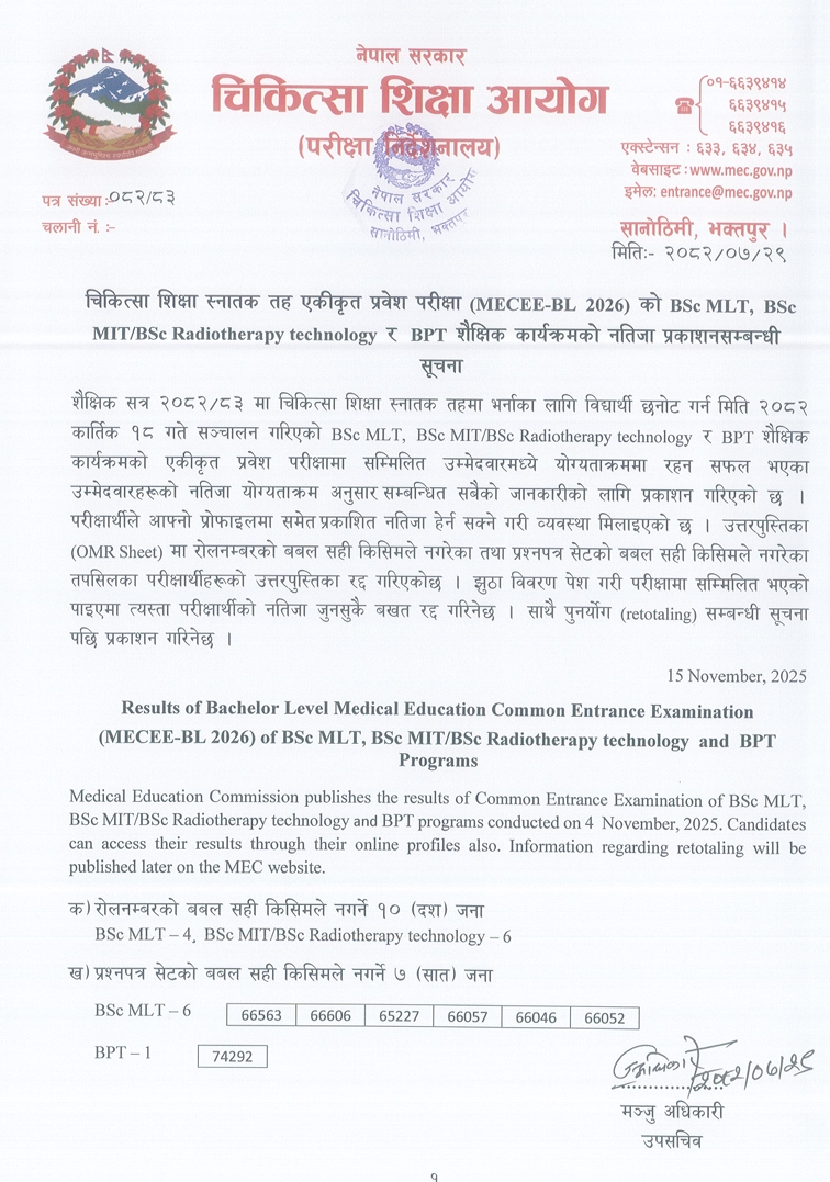 The Medical Education Commission has published the results of the Common Entrance Examination of the BSc MLT, BSc MIT/BSc Radiotherapy Technology, BPT, B Pharm, and BPH programs conducted on 18th Kartik, 2082.