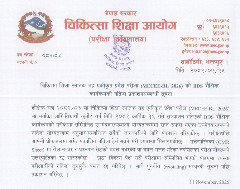 Medical Education Commission has published the results of the Bachelor Level Medical Education Common Entrance Examination (MECEE-BL 2026) of BDS Program. The examination was conducted on Kartik 16, 2082 (2nd November 2025).