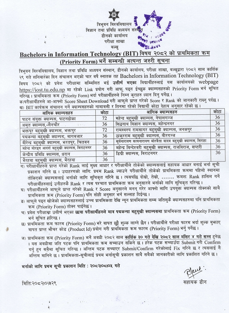 Tribhuvan University, Institute of Science and Technology, Dean's Office, invites students who have appeared in and passed the entrance examination for the four-year undergraduate program, Bachelors in Information Technology (BIT) 2082 to fill the Priority Form for the campuses they wish to study.
