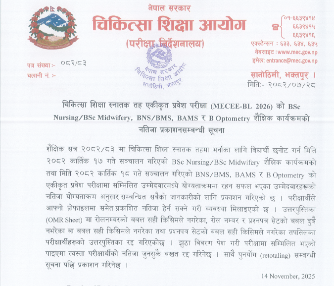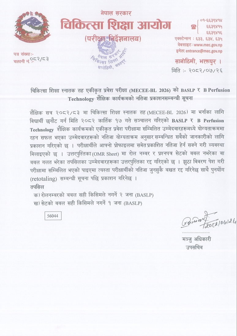 The results of the integrated entrance examination for the Bachelor Level in Medical Education (MECEE-BL 2026) for the academic session 2082/83 have been published. The exam for admission to the BASLP and B Perfusion Technology programs was conducted on Kartik 17, 2082.