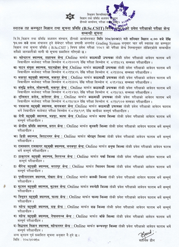 Tribhuvan University, Institute of Science and Technology, Dean's Office, has published the examination centers for the entrance examination of BSc Computer Science and Information Technology (BSc CSIT) for the academic year 2082.
